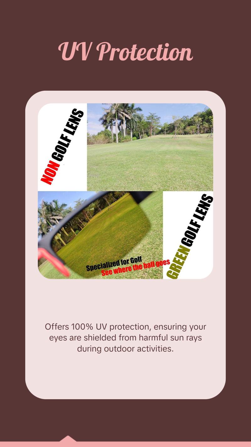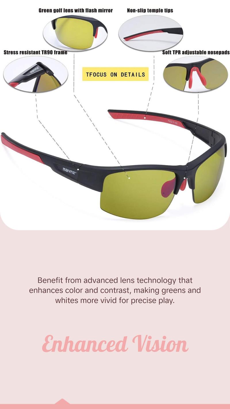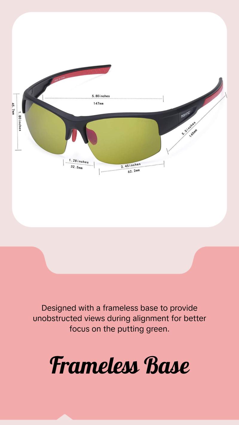 Product Description Read the Greens LIke Never Before This green golf lens is a seamless blend of art and science. Read the greens in crisp, razor-sharp detail like never before. Tested and endorsed by top golfers, maivnz innovative lens technology brings pro-level performance to every game. Improve your Game ,With a more precise visual experience ENHANCED COLOR & CONTRAST LENS TECHNOLOGY Our lens technology reinforces the brightness of colors, bringing to life the natural hues of the surrounding environment. Provide high levels of visual performance even on the sunniest of days. All this helps the brain to quickly analyze outside environmental conditions resulting in faster and more precise action time. Contrast enhancement technology creates vivid greens and vibrant whites–so you’ll never lose another ball in the rough. With sharp clarity for when it counts and a frameless base for prime visibility, your drive will thank you. EYES ON THE BALL