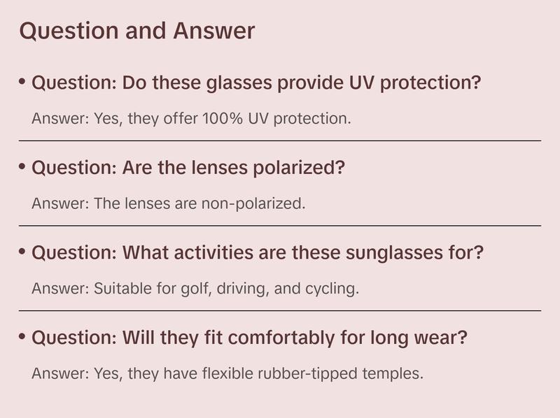 Features flexible temples tipped with rubber socks for a comfortable, secure fit that eliminates extra pressure–so you can stay a full day on the course.